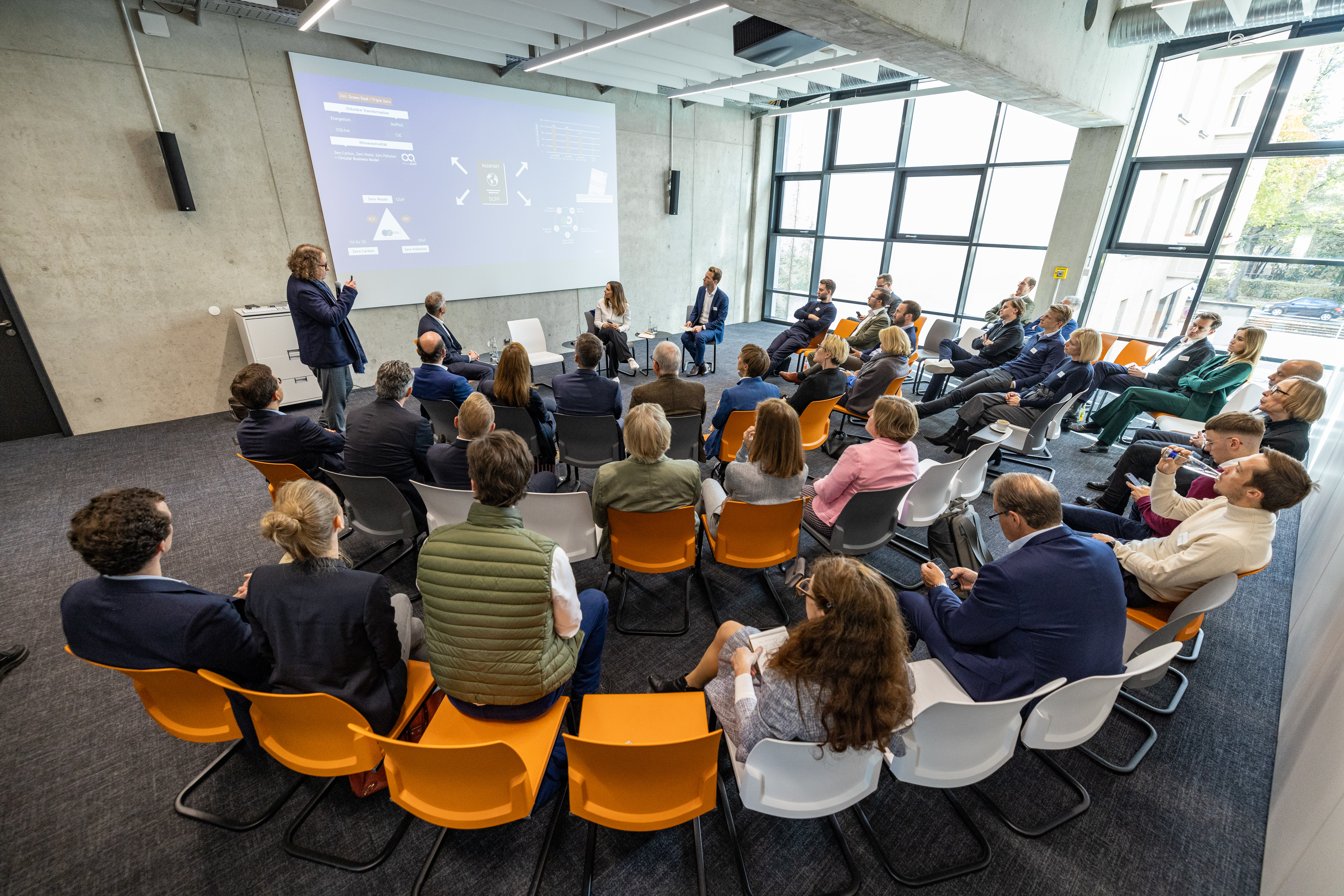 Zur Sache ging es in den Workshops zu speziellen Themen wie Digitaler Unternehmenszwilling, CO2-Messung und Zertifikatehandel in Familienunternehmen sowie Energieautonomie im Familienunternehmen. In den drei parallel laufenden Sessions gaben Unternehmerinnen und Unternehmer, moderiert von Expertinnen und Experten der “UnternehmerTUM” und der Stiftung Familienunternehmen, ihre persönlichen Erfahrungen preis und diskutierten mit den Teilnehmerinnen und Teilnehmern deren Fragen. © Stiftung Familienunternehmen / Thorsten Jochim