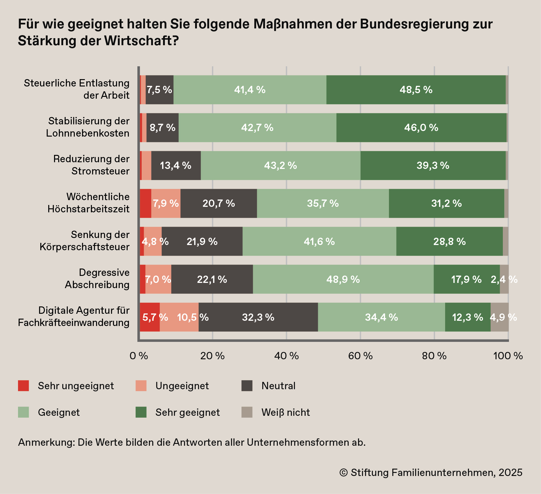 München, den 06.08.2025. Welche Einzelmaßnahmen bevorzugen die befragten 1200 Unternehmen (davon 1000 Familienunternehmen) zur Stärkung der Wirtschaft? Das wollte die Stiftung Familienunternehmen drei Monate nach dem Regierungswechsel wissen.