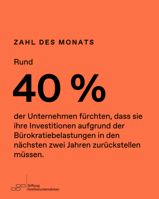 Die Hälfte der Familienunternehmen hat in den vergangenen zwei Jahren Investitionen aufgrund von bürokratischen Hemmnissen zurückgestellt; 40 Prozent fürchten, dies in den nächsten zwei Jahren tun zu müssen. Die Verlagerung von Unternehmensteilen oder gar des ganzen Unternehmens ins Ausland ist gerade für große Familienunternehmen teils eine reelle Option: 43 Prozent planen dies.
