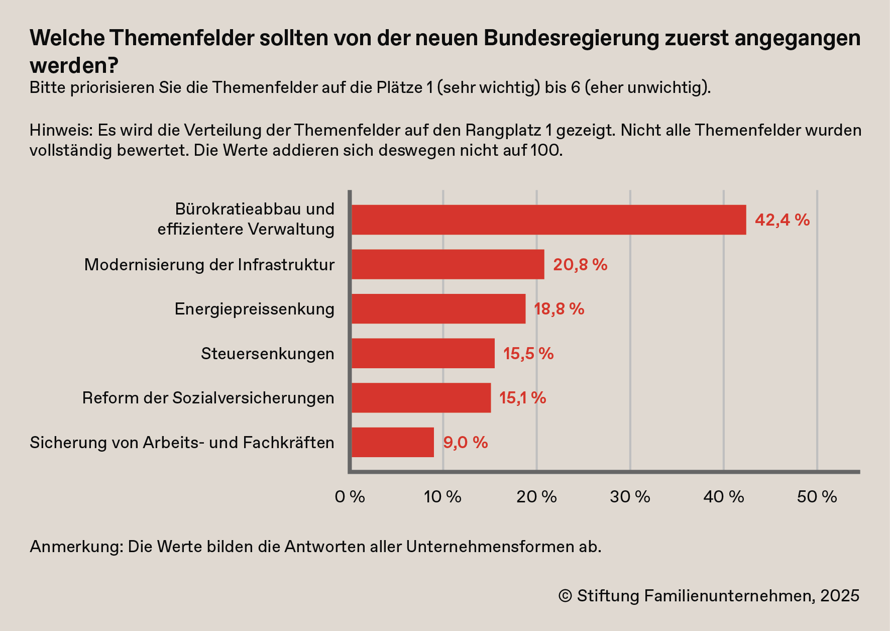 Welche Maßnahmen sollte die Bundesregierung nun zuerst angehen? Bürokratieabbau und eine effizientere Verwaltung landete bei 42 Prozent der Unternehmen auf Platz eins. An zweiter Stelle steht die Modernisierung der Infrastruktur, gefolgt von der Forderung nach Energiepreissenkungen.