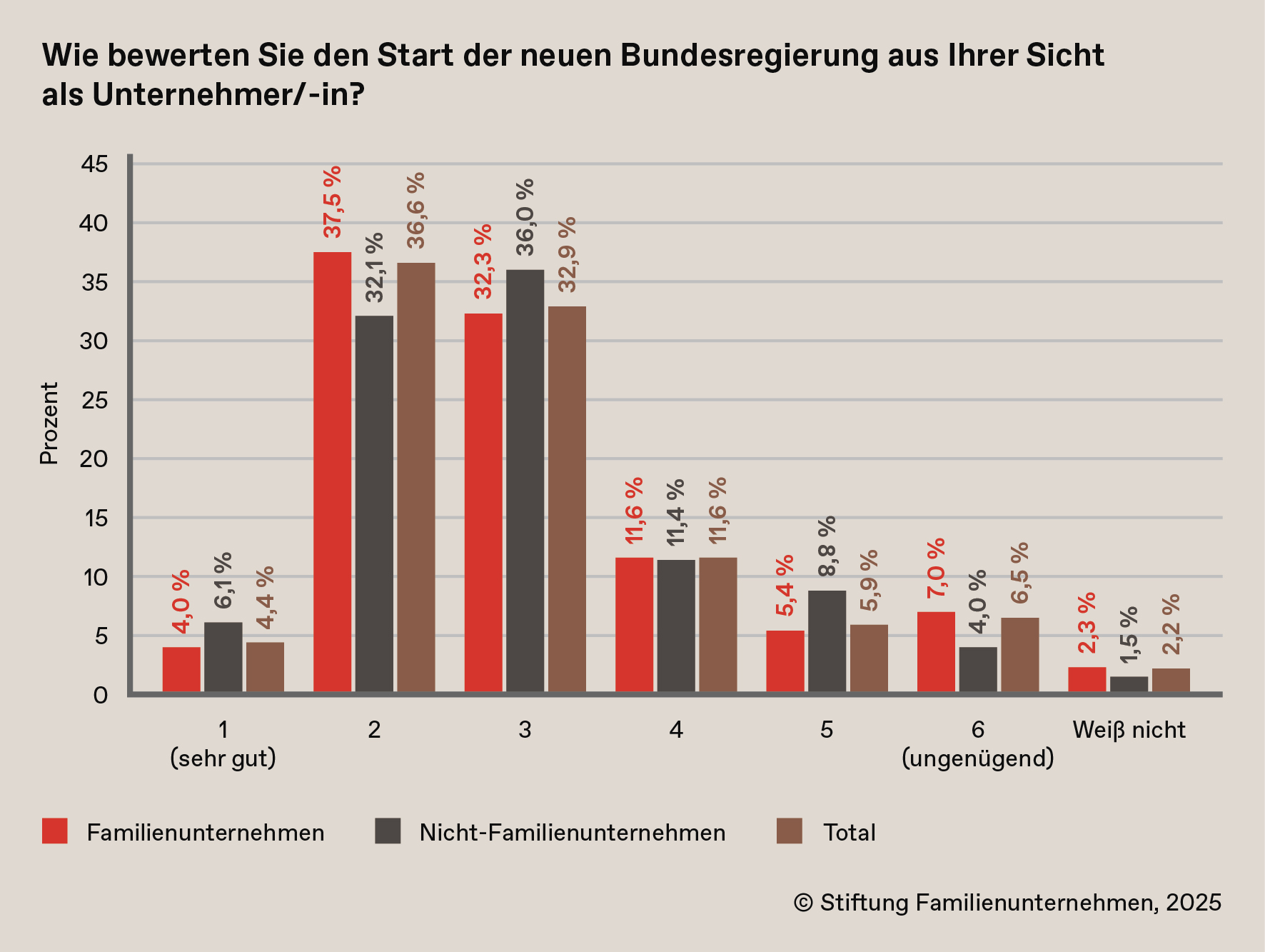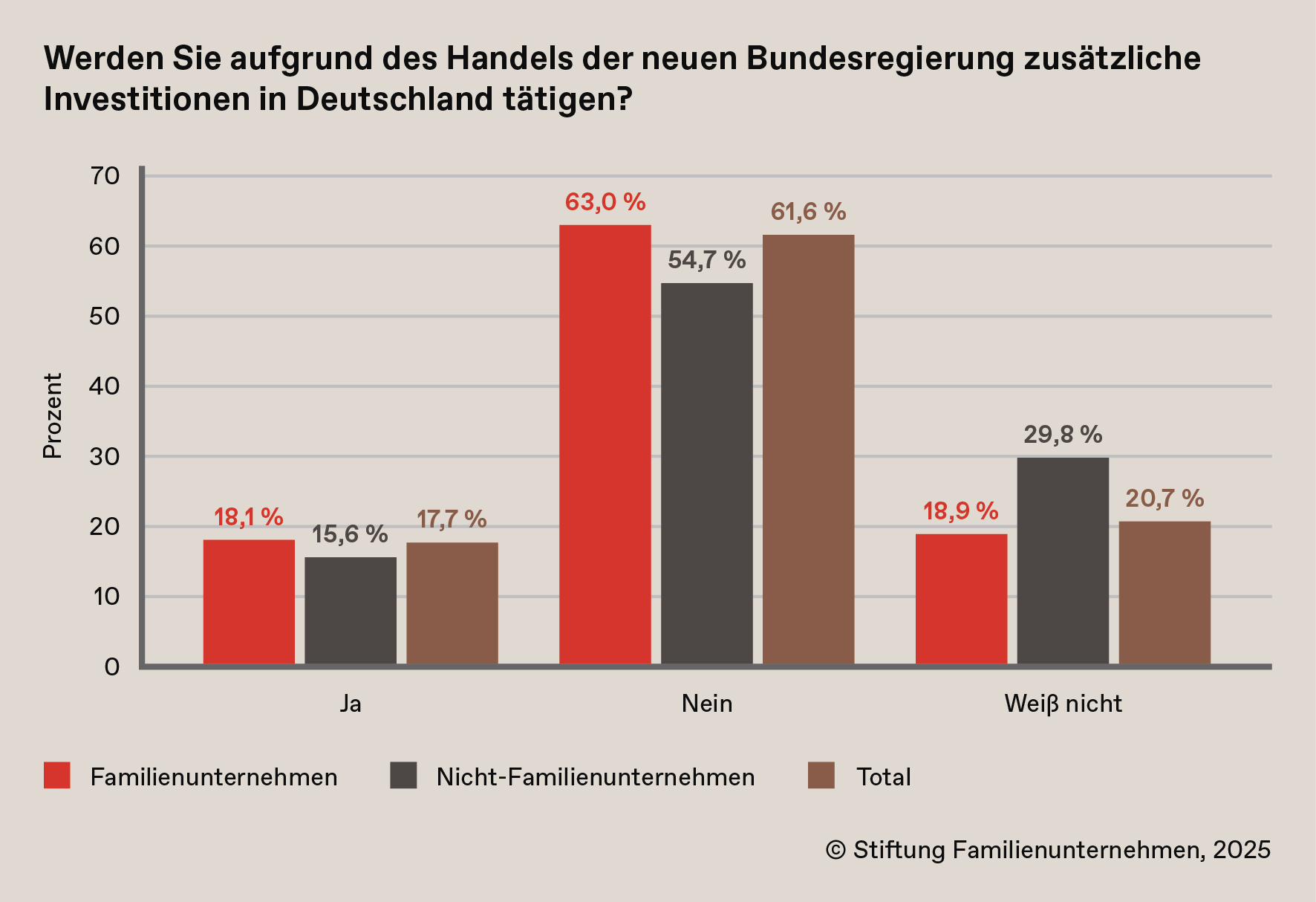 Dennoch will kein Jubel ausbrechen: Mehr als die Hälfte der Unternehmen erwartet in den nächsten Monaten für den eigenen Betrieb keine Steigerung der Wettbewerbsfähigkeit. Zwar stimmen die meisten zu, dass der Standort Deutschland durch das Handeln der Politik insgesamt wettbewerbsfähiger werde. Die Mehrzahl der Unternehmen plant aber keine zusätzlichen Investitionen. Die Familienunternehmen sind da sogar noch etwas zurückhaltender als die Nicht-Familienunternehmen.